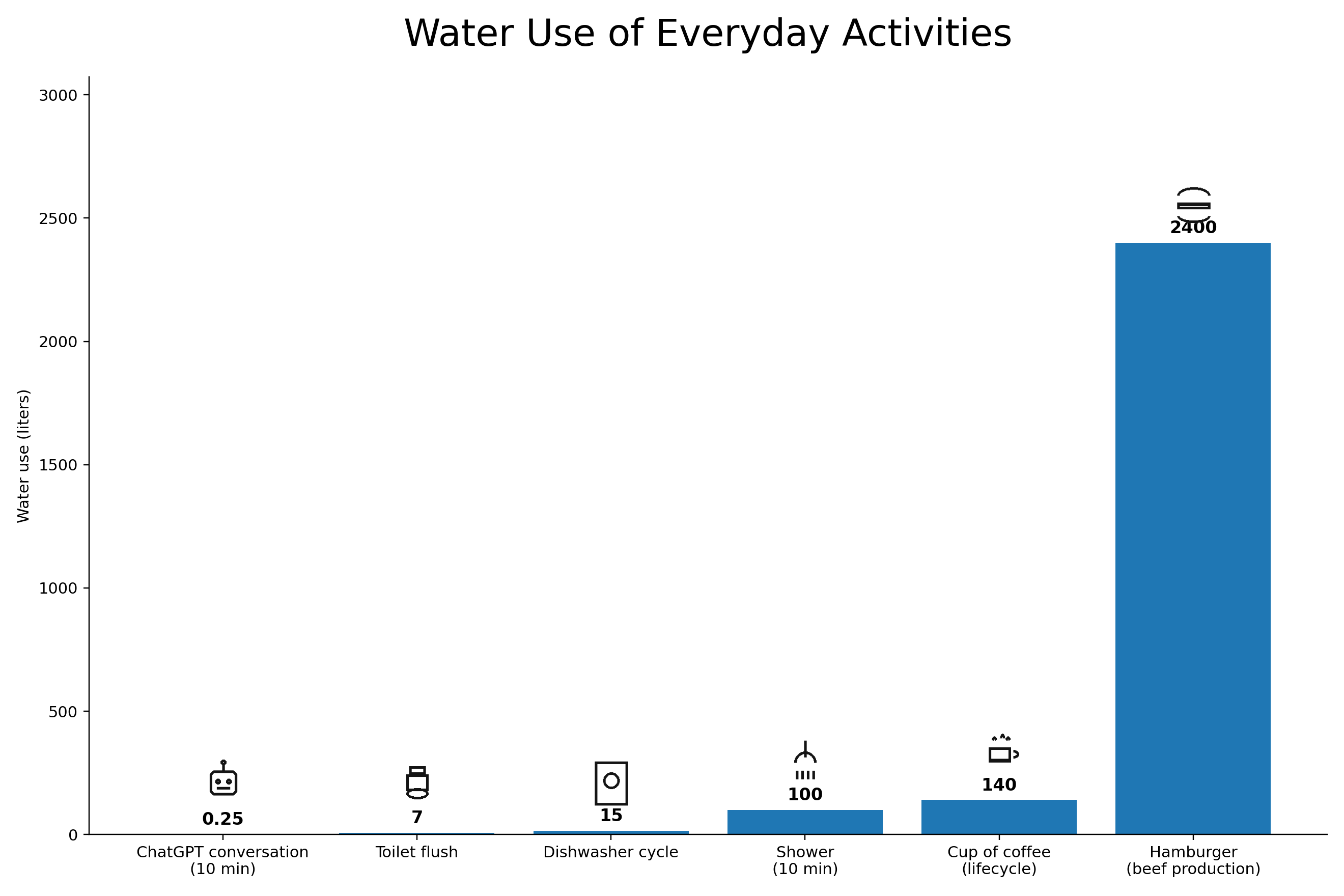 But once a model is trained, the marginal energy cost of using it is relatively modest. Estimates suggest that a 10-minute AI conversation consumes roughly as much electricity as a few minutes of streaming video online, and less than a comparable session of PC gaming. Similarly, research on data center water usage suggests that a brief AI interaction corresponds to a few hundred milliliters of water when indirect energy use is included.